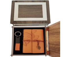 Özel Ahşap Kutulu Taba Deri Defter ve Anahtarlık Set
