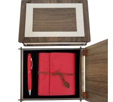 Özel Ahşap Kutulu Kırmızı Deri Defter ve Kalem Set