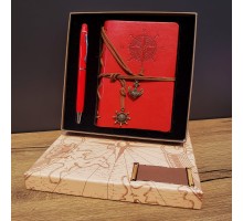 Özel Tasarım Pusula Desenli Kutu Ve Içinde Bulunan Kırmızı Pusula Deri Defter Ve Kırmızı Tükenmez Kalem..