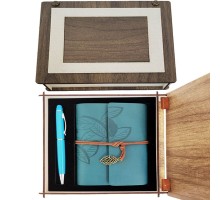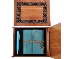 Özel Ahşap Kutulu Mavi Deri Defter ve Kalem Set