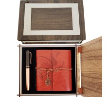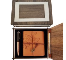 Özel Ahşap Kutulu Taba Deri Defter ve Bakır Roller Kalem Set