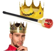 Altın Renk 60 cm Kral Tacı Kraliyet Tacı ve Kırmızı Topuzlu Kral Asası Seti
