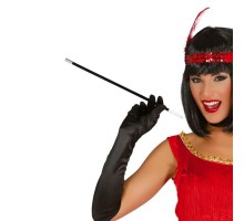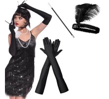 1920 ler Tarzı Siyah Tüylü Saç Bandı Rugan Siyah Eldiven ve Siyah Otri̇ş Seti