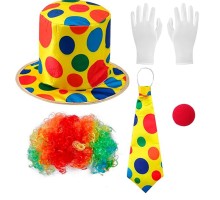 Rengârenk kıvırcık palyaço peruğu, kırmızı sünger burun ve komik yuvarlak gözlükten oluşan b..