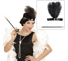 1920 ler Tarzı Siyah Tüylü Saç Bandı Rugan Siyah Eldiven ve Siyah Otri̇ş Seti